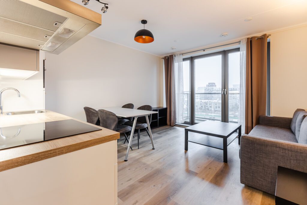 The bright living room has a door leading to the balcony and is connected to the open kitchen. The kitchen is neatly finished and equipped with, among other things, an oven, dishwasher, induction hob and fridge with freezer compartment.