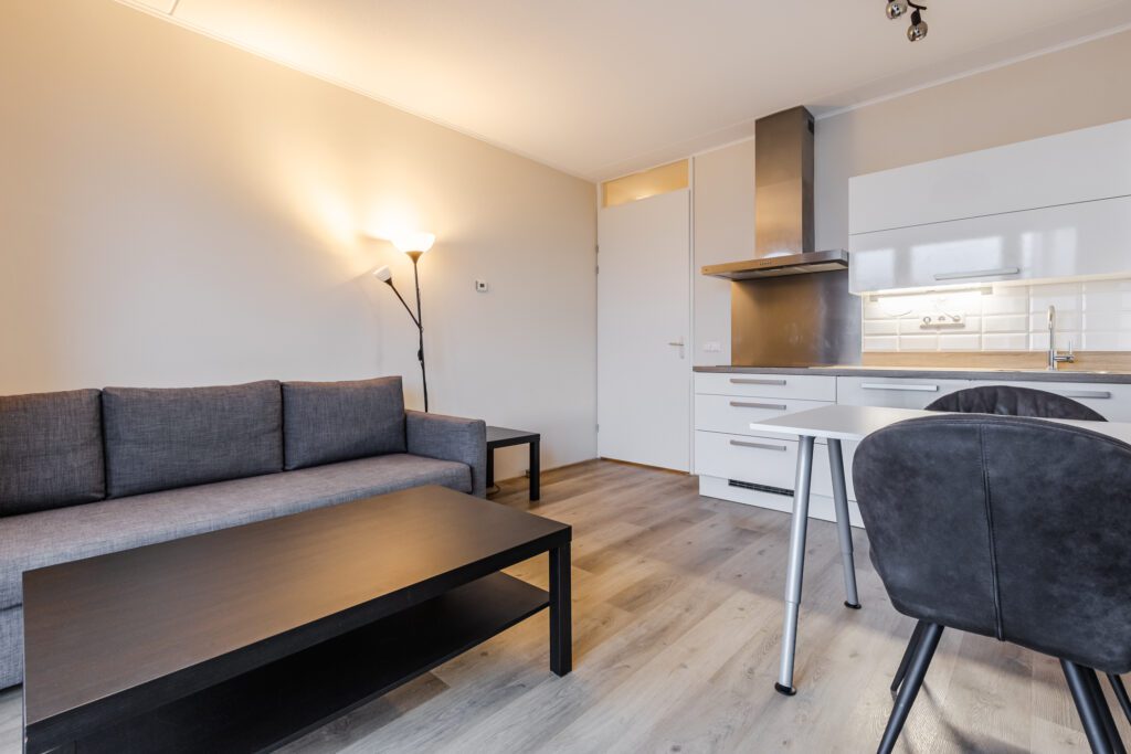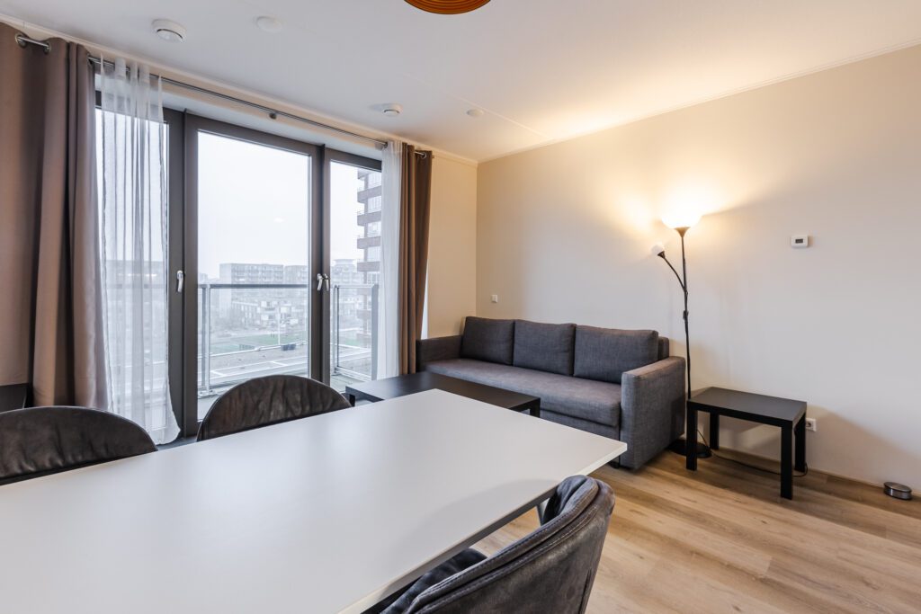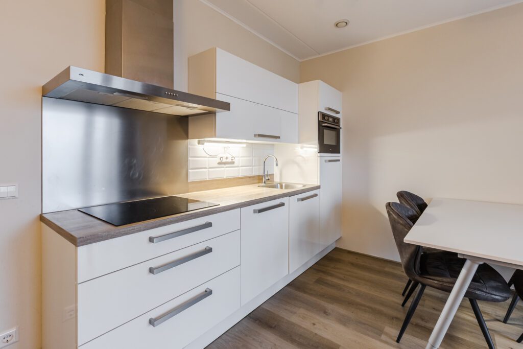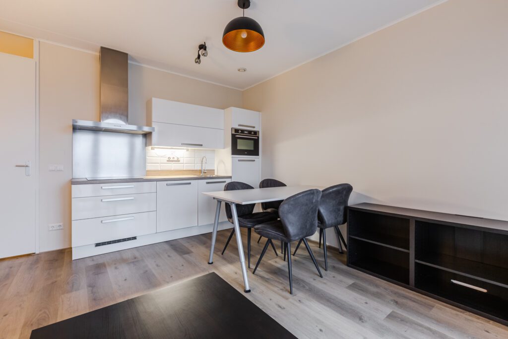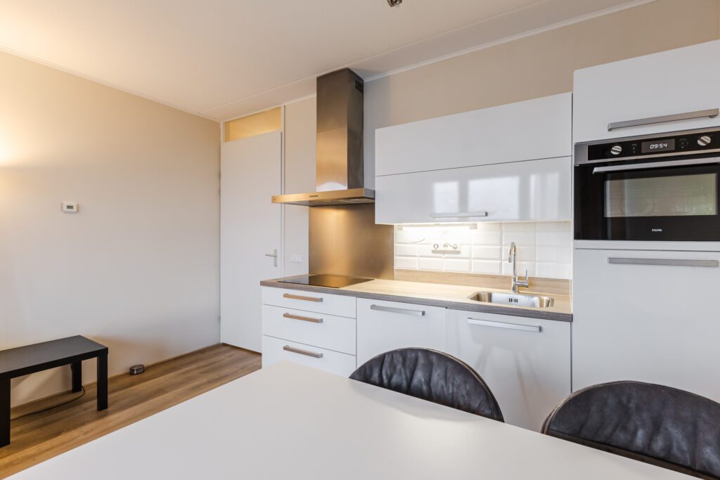 De lichte woonkamer heeft een deur naar het balkon en staat in open verbinding met de keuken. De keuken is netjes uitgevoerd en voorzien van onder andere een oven, vaatwasser, inductiekookplaat en koelkast met vriesvak.