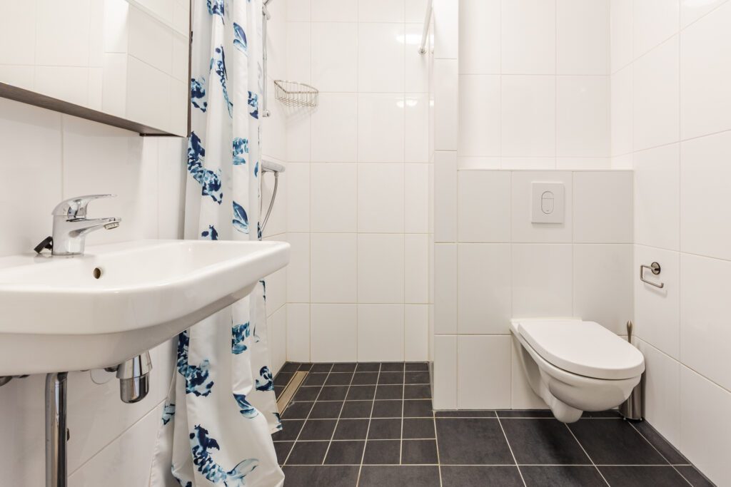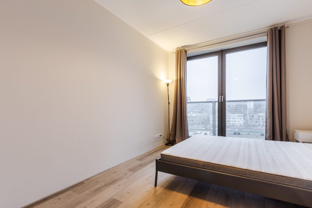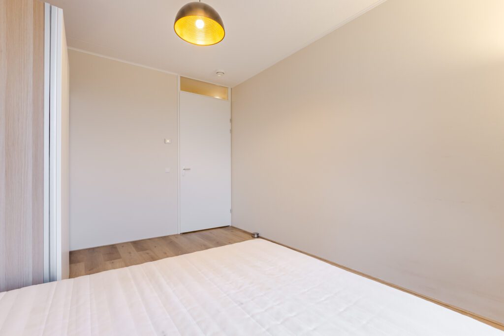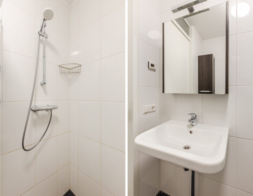 De slaapkamer is ruim en heeft dubbele deuren naar het balkon. De badkamer is netjes onderhouden en voorzien van een inloopdouche, wastafel en toilet. Daarnaast is er een aparte technische/bergruimte met aansluitingen voor wasmachine en droger.