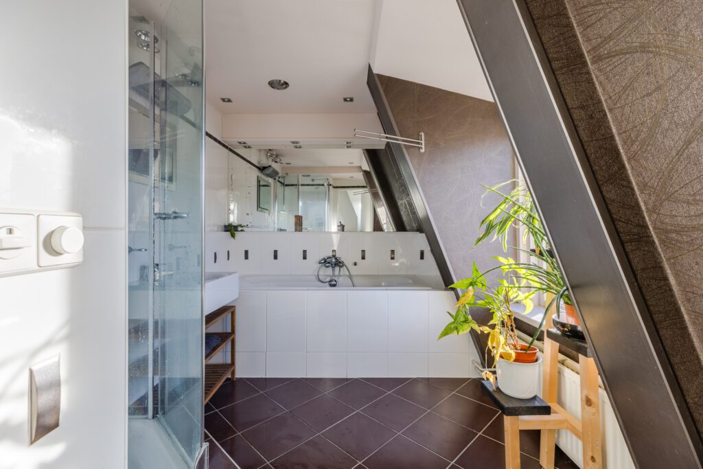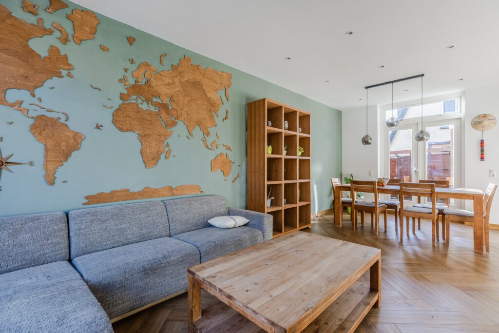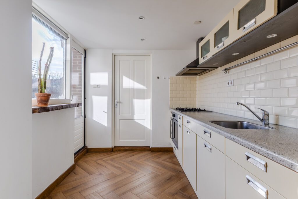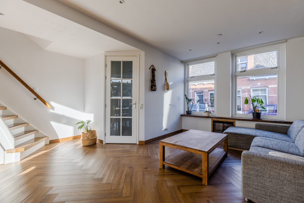 De woning beschikt over een lichte en royale doorzonwoonkamer waar het daglicht door de vele ramen mooi naar binnen valt en zorgt voor een warme en uitnodigende leefruimte. De keuken bevindt zich in de uitbouw aan de achterzijde en is praktisch ingericht met onder andere een gaskookplaat, afzuigkap, oven en vaatwasser. Aansluitend ligt de bijkeuken met aansluitingen voor wasmachine en droger en de opstelling van de cv-ketel (2024).