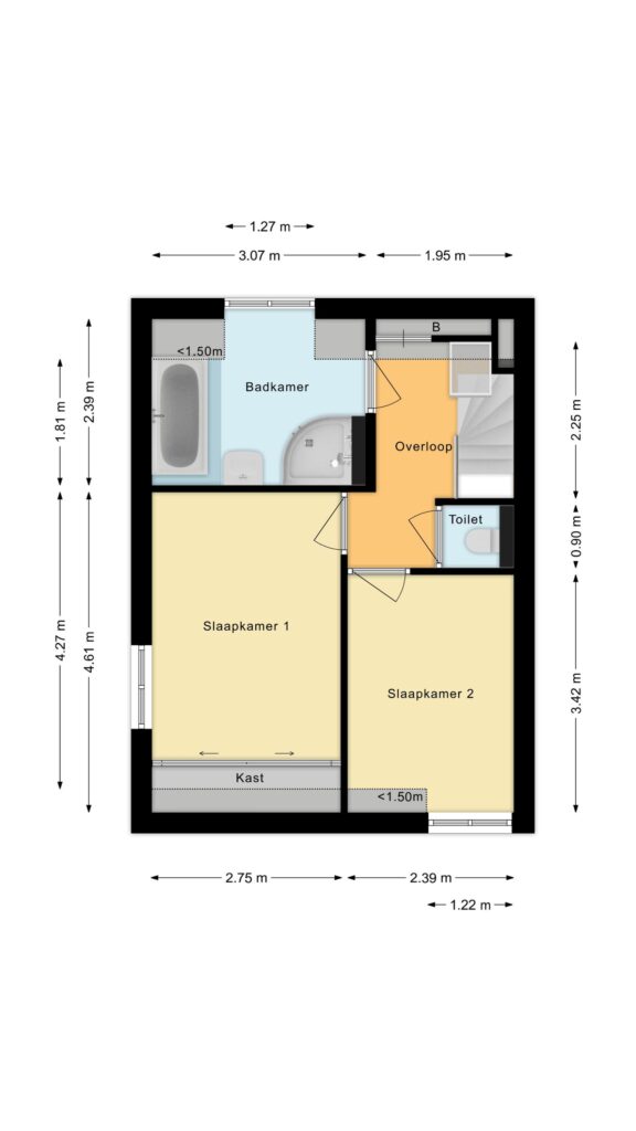 Op de eerste verdieping bevinden zich twee goed bemeten slaapkamers, bergruimte, een separaat tweede toilet en een nette badkamer met ligbad, douchehoek en wastafel.
